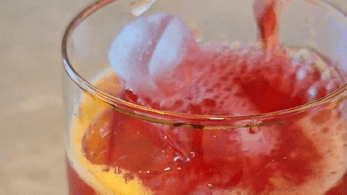 그 위로 히비스커스 티를 천천히, 아주 천천히 부어주면 붉은 히비스커스와 오렌지 컬러가 자연스럽게 층을 이루며 노을 지는 듯한 비주얼이 완성된답니다